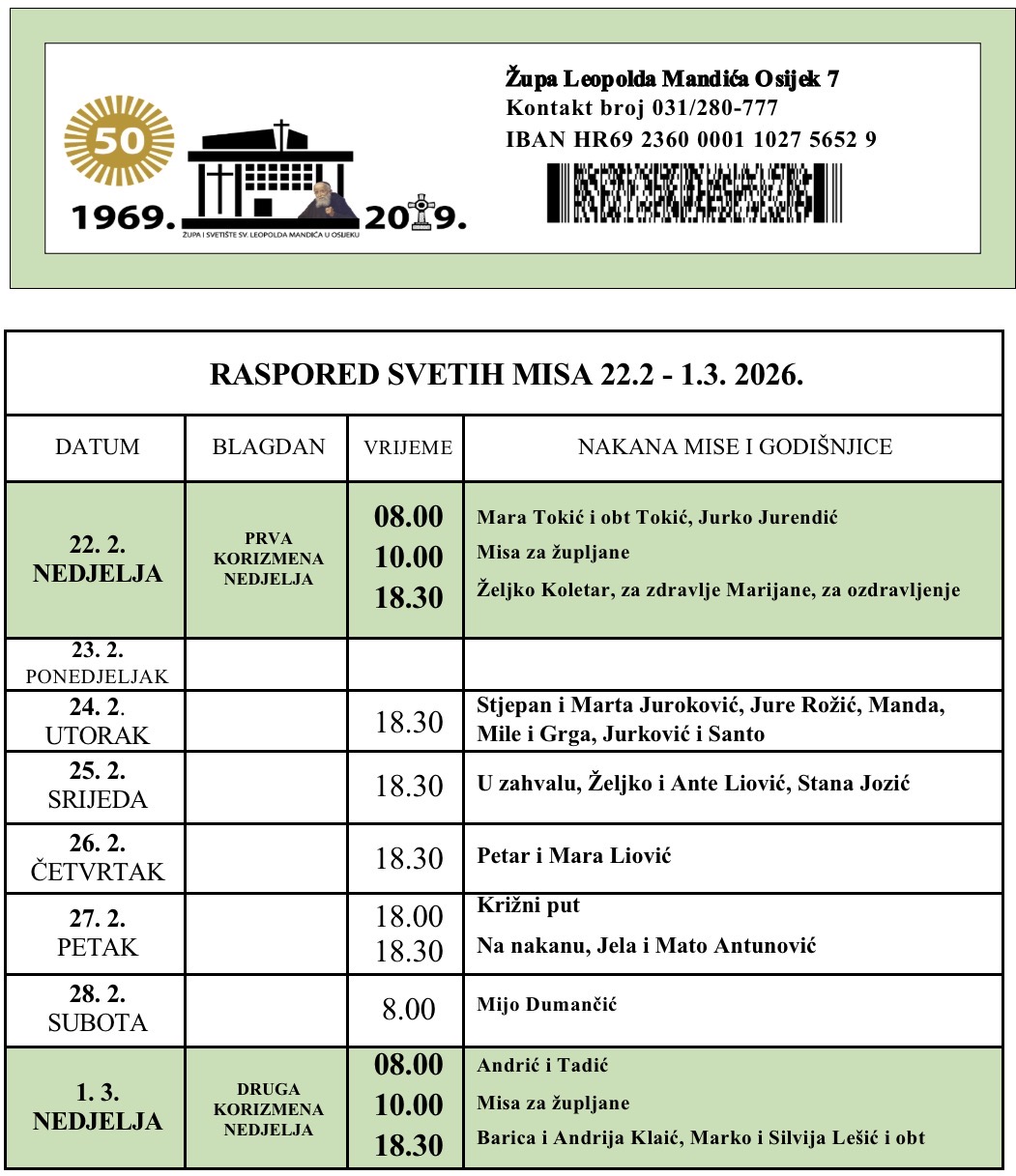 ŽUPNE OBAVIJESTI18. siječnja 2026.LUKNO/ČLANARINA DOPRINOS ZA ŽUPU Prema novim smjernicama nadbiskupije doprinos (Lukno) župljana za našu župu sv. Leopolda iznosi 40.00 eura godišnje po bračnome paru. Možete ga uplatiti u župnom uredu ili „internet bankarstvom“ na župni račun. Radi bolje evidencije molimo da uz ime navedite adresu i broj župne knjižice: Račun župe u banci […]